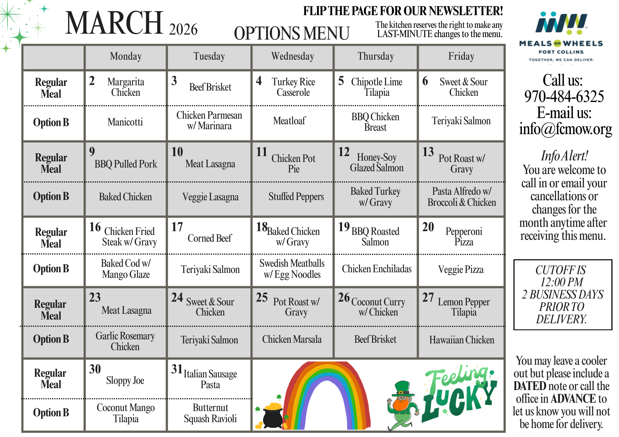 - You may cancel your meal for any particular day, but cancellations must be called in no later than NOON, two (2) business days before the days you need the cancel.